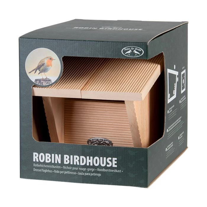 Cette boîte convient au rouge-gorge. En plus du rouge-gorge, les oiseaux suivants peuvent utiliser ce nichoir : le gobe-mouche gris et le rougequeue à collier. En hiver, la cabane à oiseaux est souvent utilisée par les oiseaux comme abri. Le nichoir est livré dans une boîte cadeau en couleur.