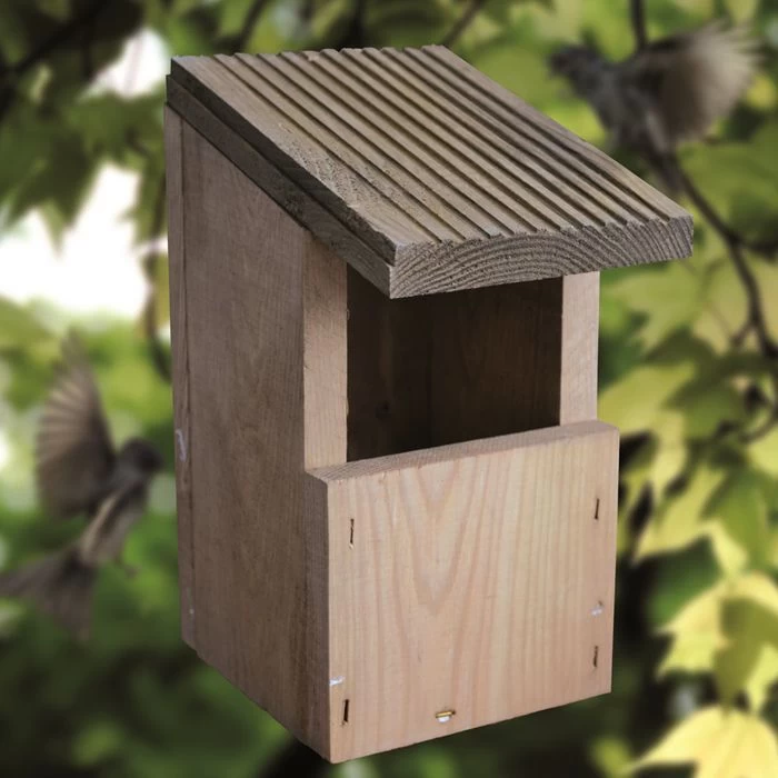 Ce nichoir en bois garanti FSC est parfait pour les oiseaux sauvage s du jardin tels les Rouges-gorges et les mesanges. Sont ouvertures plus importante à l’avant procure à ces oiseaux l’endroit idéal afin de faire leur nichée.Sa forme parfaite est idéale afin de la plaquer sur un arbre ou sur le devant de votre maison loin de tous prédateurs.